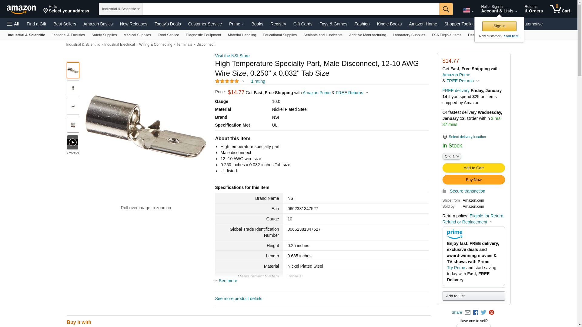 NSI HTM12-250-3 High Temperature Male Disconnect, 12-10 AWG Wire Size, 0.250" x 0.032" Tab Size