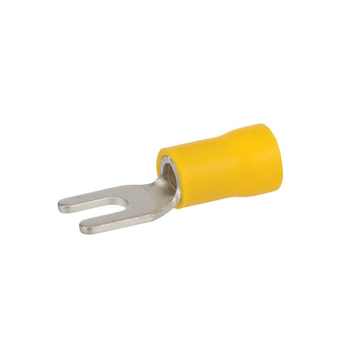 NSI S Model Copper spade terminal in yellow color, accommodates conductor of size 12-10 AWG and has voltage rating of 300 Volts. This electro tin-plated spade terminal has 1/4 Inch stud size and vinyl insulation. This spade terminal has 0.472-Inch tang and 0.492 Inch x 0.255 Inch ID barrel. The 1.228-Inch spade terminal withstands a temperature rating of 75 deg C. Spade terminal is engineered to use on free-standing studs and for wire termination. Spade terminal is UL/cULus listed and CSA certif