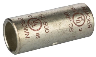 Standard Barrel Tinned Copper Splice 500 MCM Standard Barrel Tinned Copper Splicesare produced from high conductivity copper tubing. Serrations indicate proper crimp locations. Tin-plated to provide corrosion resistance. Marked with die index and color code. Suitable for use at voltages up to 35KV provided connector is properly taped. 5KV is the maximum voltage in all bare splices. AL9CU. Rated 600V, 90 degrees C. SPECIFICATIONS: QUANTITY: 1 Count RATED: 35KV Max WIRE RANGE: 500 MCM EXPANDED WIRE RANGE: 500 MCM - 250 MCM COLOR CODE: Brown ID: 0.835 OD: 1.063 LENGTH: 2.500 BRAND EQUIVALENT: Blackburn CSP500 Burndy YS34L Ilsco CT500 Homac SC 500 Morris 94436 Panduit SCS500-6 Penn Union BCU-500 MANUFACTURER: NSi Industries PART NUMBER: SC-500 UPC: 662381037145 We have the best selection and prices on connectors.