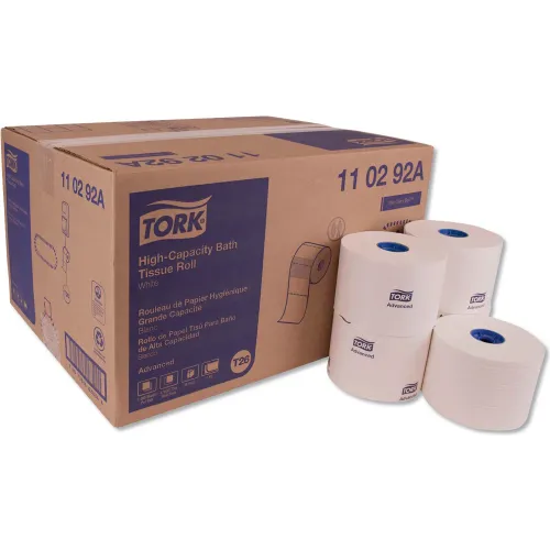Tork Advanced High-Capacity Bath Tissue provides hygienic dispensing while reducing waste and maintenance expense. Enhances image to everyday washrooms. High capacity rolls eliminate service outages. Embossed rolls enhance bulk and softness. The banded rolls create less waste and source reduction. The easy start tail seal prevents waste. Tork bath tissue has rapid breakup, ideal for all plumbing systems. Made from 100% recycled fibers an environmental benefit, and a positive image builder. Replaces 120299 and 110292. EcoLogo Certified.