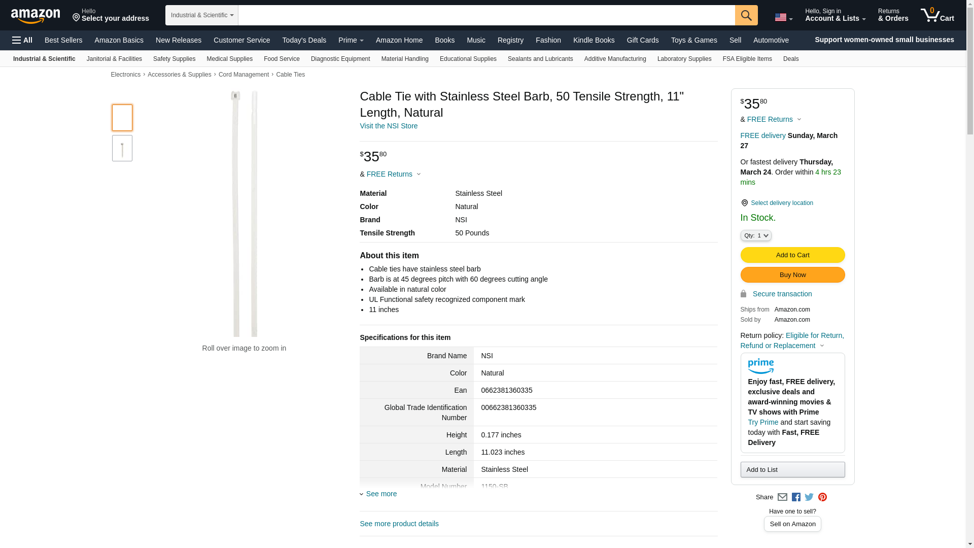 Cable Tie with Stainless Steel Barb, 50 Tensile Strength, 11" Length, Natural