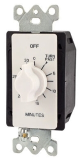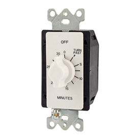 This 30 minute Springwound Auto Off In-Wall Timer with no hold turns your Whole House Fans, Indoor/Outdoor Lighting, Bathroom Fans and Lights, Self-Storage applications at selected time up to 30-minutes. It will stop the circuit at end of cycle to cut electrical power to unit being controlled. This timer fits standard or decorator style wall plates (wall plate not included).