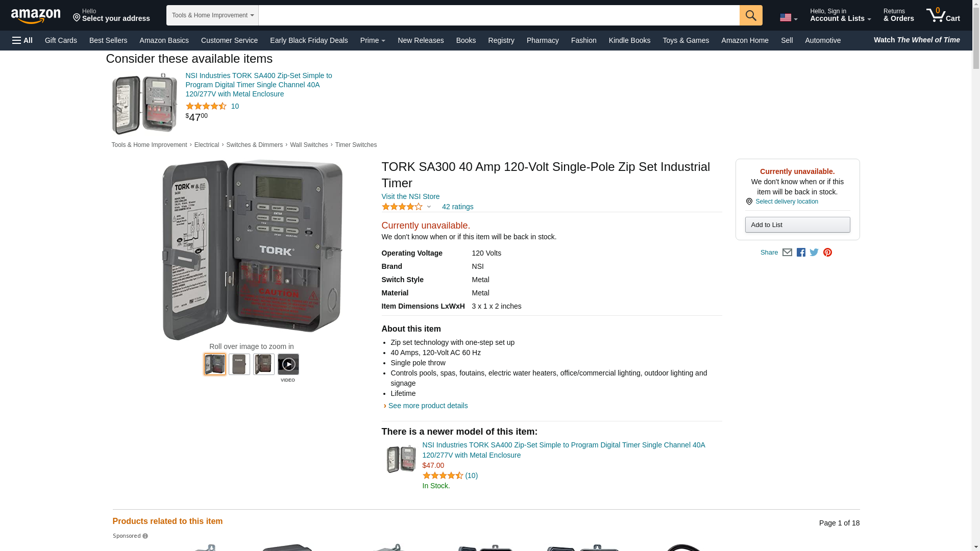 SA300 Zip-Set SPST Digital Time SwitchAPPLICATIONS:Outdoor lightingElectric motorsIndoor lighting or signsFEATURES:ZIP-SET: Fast and easy. Just enter area code and timer adjusts to your time with preset program of Sunset ON and time off program.SCHEDULING: One ON/OFF set point pair is active at a time. Only one schedule may be active at a time: Schedule 1, Schedule 2, a combination of 1 & 2, or ZipSet. Day combinations for 7-5-2 speed programming. MANUAL DAYLIGHT SAVING: Simple switch adjustment. MANUAL OVERRIDE: Until the next regularly scheduled ON or OFF, automatic operation then resumes. RANDOM FEATURE: Varies on time +/- 90 minutes each day for lived in look. CLOCK FORMAT: AM/PMPOWER OUTAGE BACKUP: Replaceable batteriesOUTPUT CONTACTS: SPSTINPUT VOLTAGE: 120VAC, 60HzTERMINAL RANGE: #8 - #16 AWGOPERATING TEMPERATURE: 32 degrees to 100 degrees F (0 degrees to 37 degrees C)POWER CONSUMPTION: 5VA Max.ENCLOSURE: Indoor Metal with locking hasp. MANUFACTURER: TorkPART NUMBER: SA300UPC: 786261165466CONTACT RATINGS:120VAC, 40A Resistive120VAC, 40A Inductive120VAC, 40A Tungsten120VAC, 40A Incandescent120VAC, 1 1/2 HP MotorWe have timers to fit your every need, with the best selection and prices.