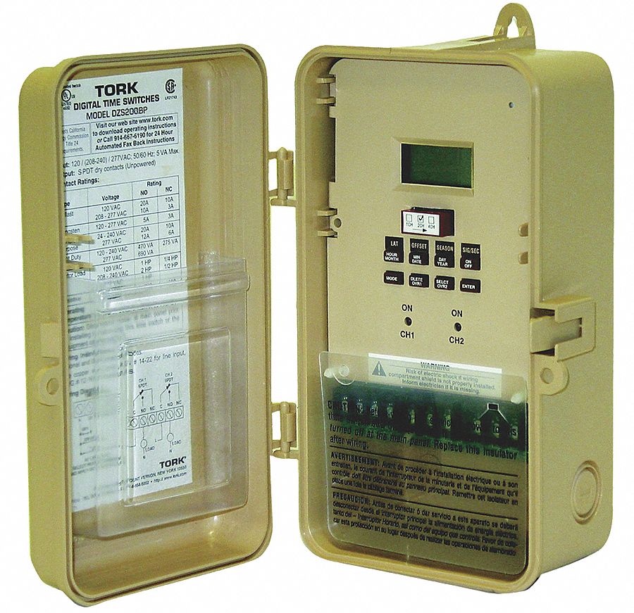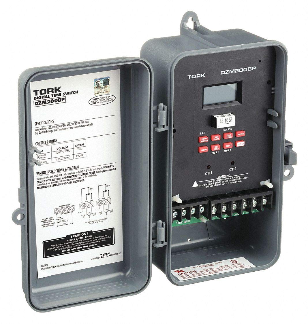 | Feature | Price For: Each Number of Poles: 1 Color: Tan Backup Time: 7 days Description/Special Features: Memory Module Supplied for Easy Copy and Transfer of Schedule Between DZM200BP Units, Capacitor for Permanent Schedule Retention, Locking Hasp, Single Holiday & Seasonal Scheduling Item: Electronic Timer Number of Channels: 2 Contact Form: SPDT Voltage: 120/208 to 240/277VAC Amps: 20 |