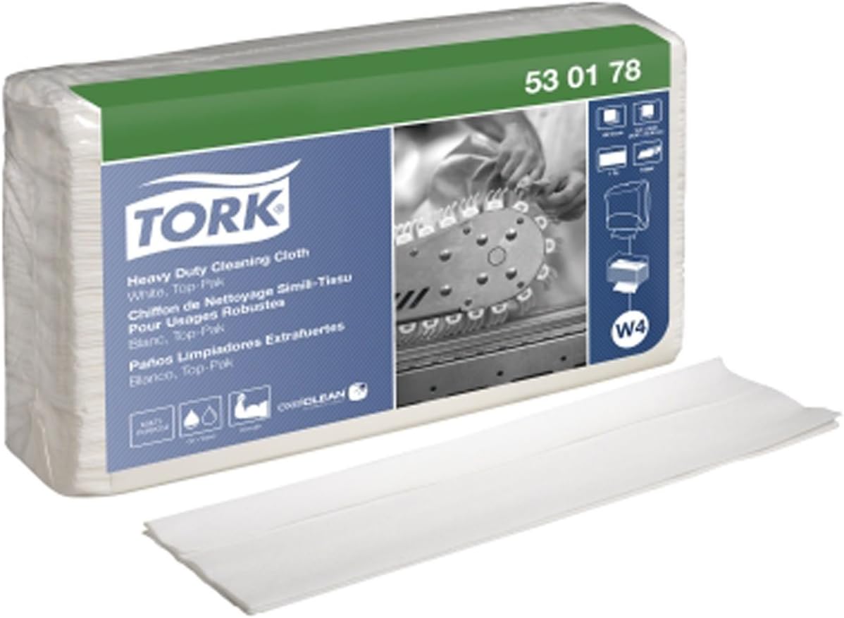 TORK 530178 Heavy-Duty Cleaning Cloth, Top-Pak, 1-Ply, 15.2" Width x 16.85" Length, White (Case of 5 Packs, 100 per Pack, 500 Wipers per Case)