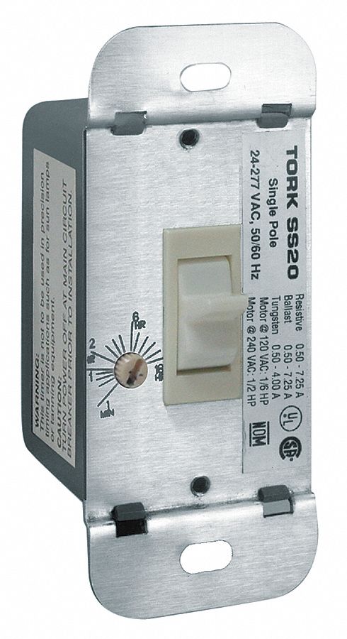 | Feature | Price For: Each Standards: UL/CSA Min. Time Setting: 1 min. Number of Gangs: 1 Item: Wall Switch Timer Length: 2-5/8" Type of Switch: Electronic Depth: 1-1/2" Width: 1-11/16" Watts: 12/150 HP @ 240V: 1/2 Style: Wall Switch Features: Flicker Warning Before Time Out, Not Compatible with CFL and Electronic Fluorescent Ballast Min. Time Setting: 1 min. |