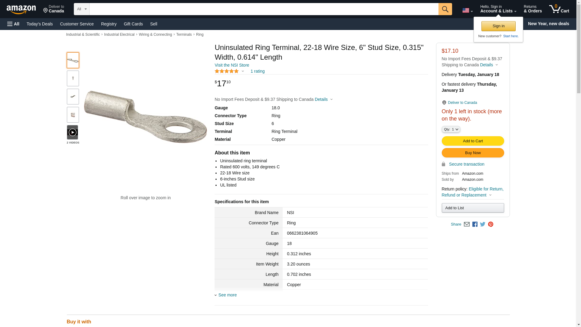 Uninsulated Ring Terminal, 22-18 Wire Size, 6" Stud Size, 0.315" Width, 0.614" Length