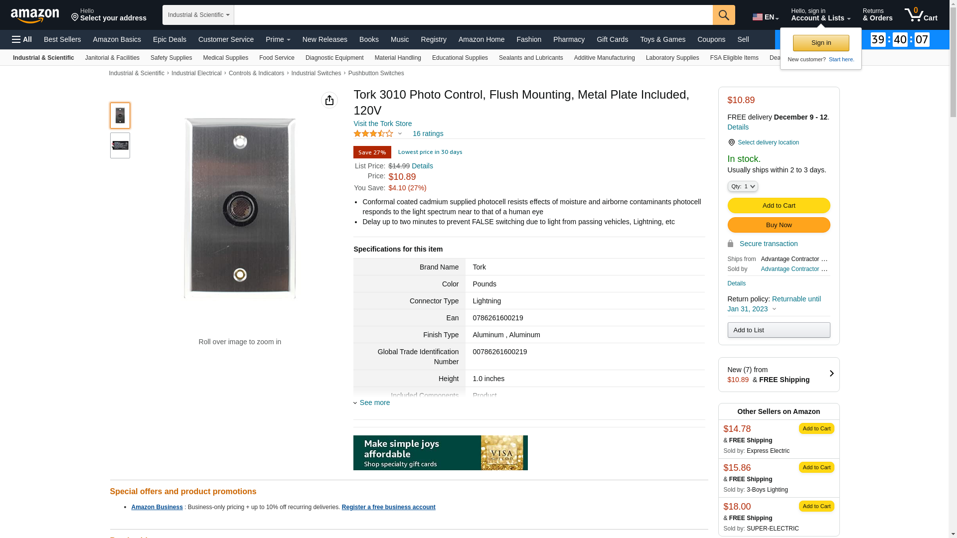 Tork 3010 Photo Control, Flush Mounting, Metal Plate Included, 120V