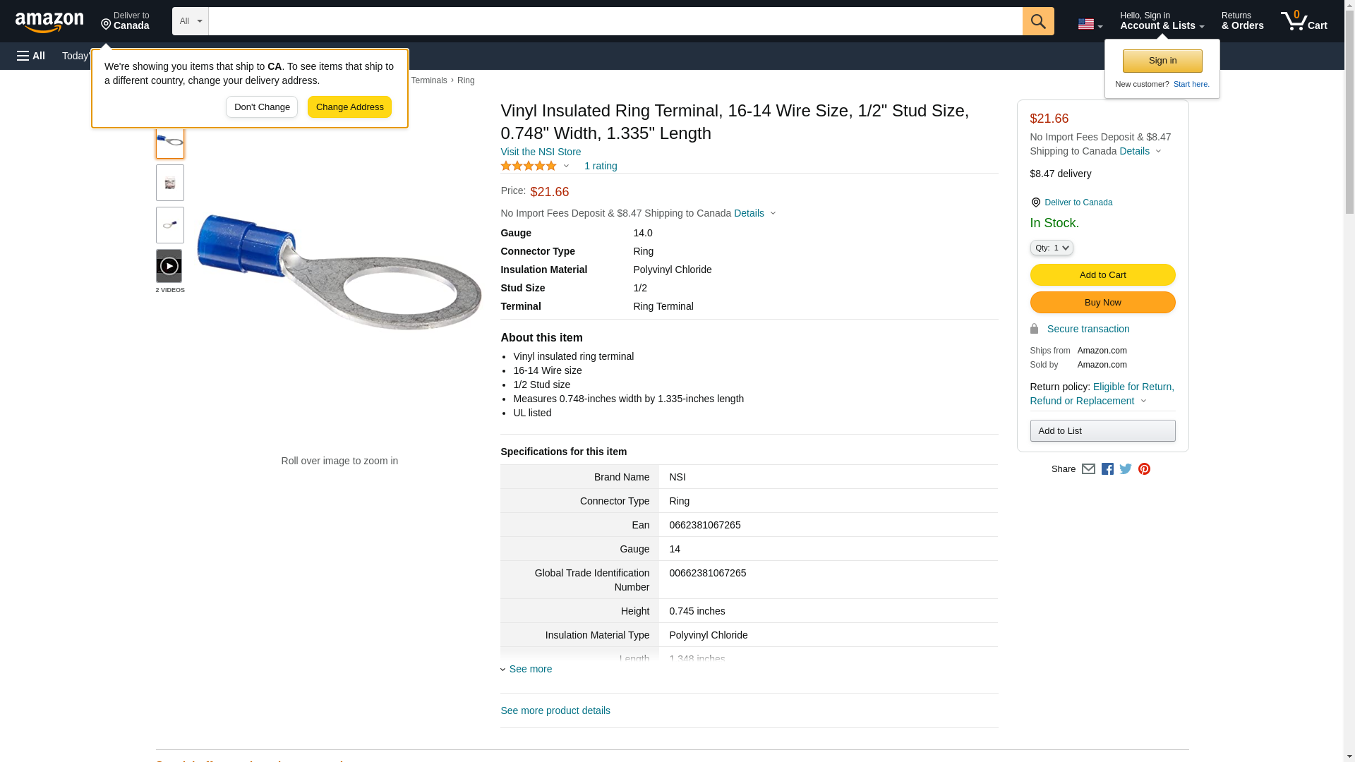 Vinyl Insulated Ring Terminal, 16-14 Wire Size, 1/2" Stud Size, 0.748" Width, 1.335" Length