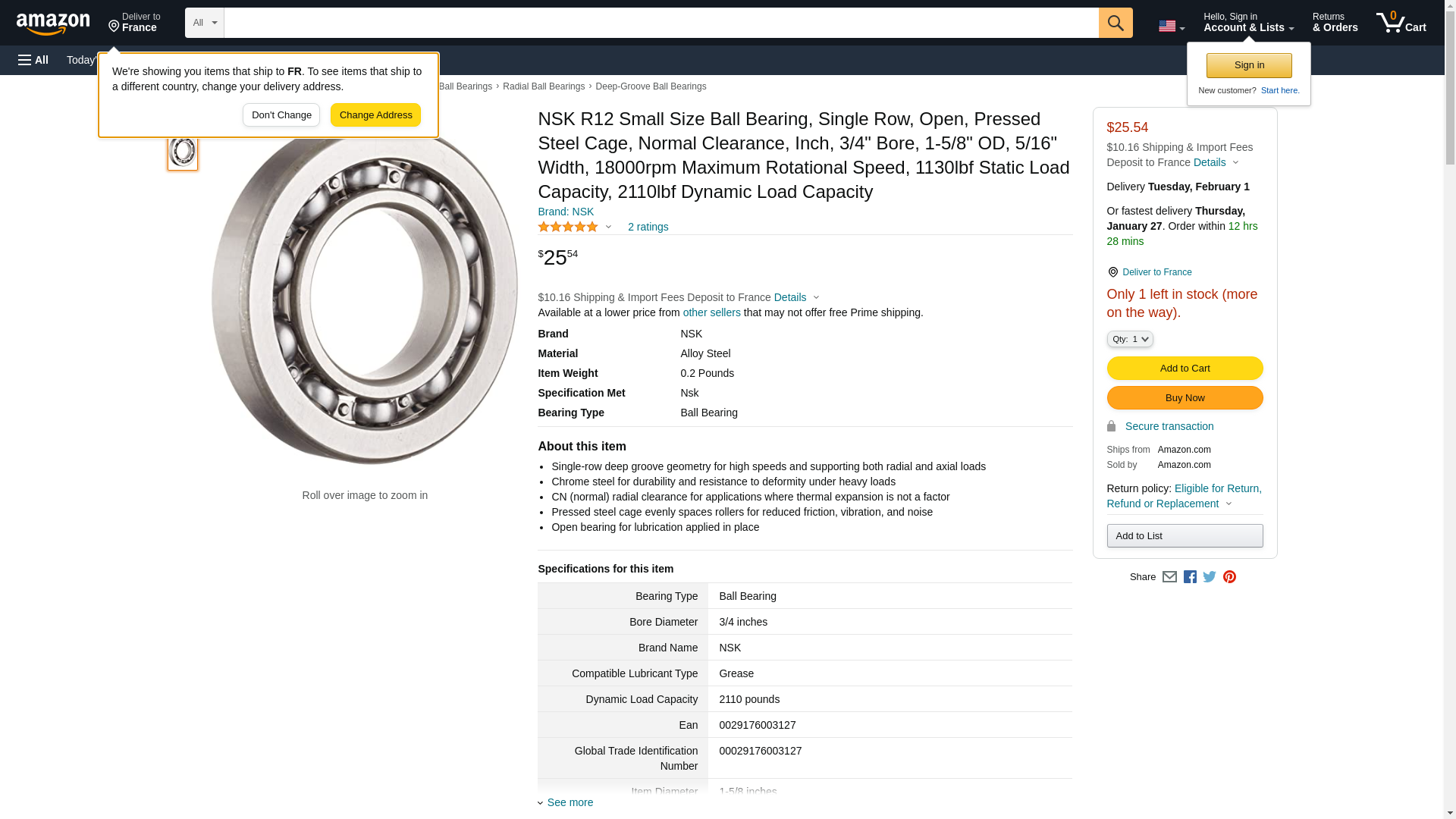 NSK R12 Small Size Ball Bearing, Single Row, Open, Pressed Steel Cage, Normal Clearance, Inch, 3/4" Bore, 1-5/8" OD, 5/16" Width, 18000rpm Maximum Rotational Speed, 1130lbf Static Load Capacity, 2110lbf Dynamic Load Capacity