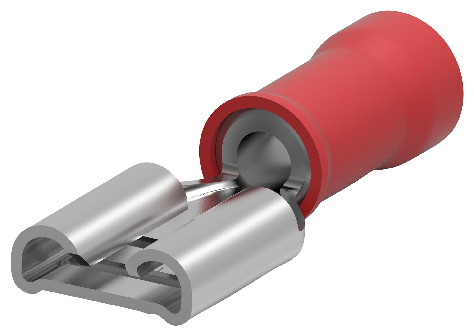 RECEPTACLE/Female, insulated, red, 300 VAC, PIDG series. Stud/tab size: 4.75 mm X .51 mm. For use with 22-18 gauge wire.