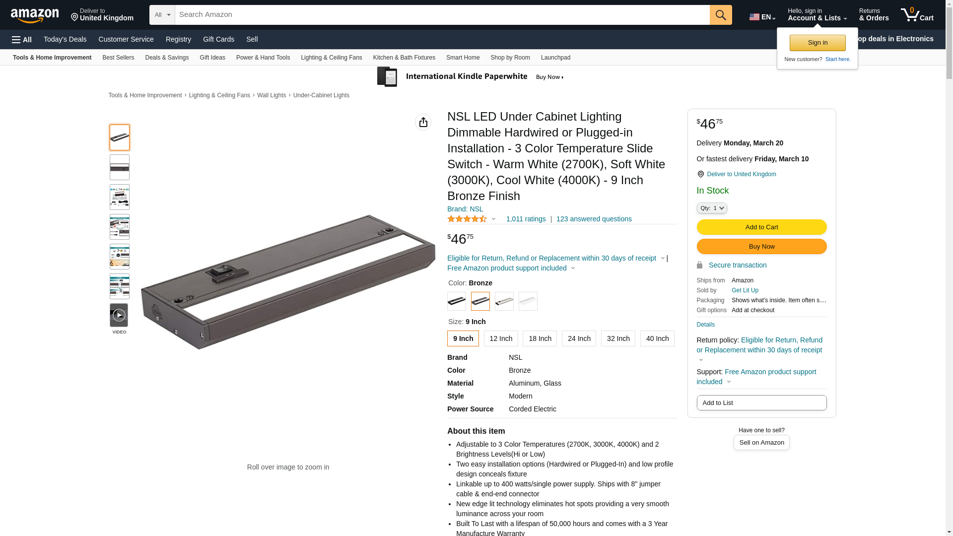 <p>This stunning LED Under Cabinet Fixture is constructed with an aluminum housing and a matte white polycarbonate diffuser. It has a hi-low rocker switch for brightness and a slide selector switch for changing Kelvin colour temperature. This sleek fixture features edge lit technology which means no hot spots on the polished marble or granite counter top. 1 inch low profile design means the fixture remains hidden. The quality of light is the best in the Industry with a 90 color rendering index (CRI) and up to 60 lumens per watt. Rated to 50,000 hours and dimmable with most ELV dimmers, this fixture is the most versatile task light on the market today.</p><p><b>Features</b><br><br>Adjustable to 3 color temperatures: 2700K, 3300K and 4000K<br>Dimmable with most ELV dimmers<br>Comes with High/Low Brightness Switch<br>Low Power Consumption<br>Edge Lit Technology eliminates hot spots-smooth luminance<br>Fast and easy installation-quick connects, captive mounting holes<br>Shallow profile conceals fixture<br>Linkable up to 400 watts<br>cETLus and Energy Star Listed<br>3 Year Limited Warranty</p><p><b>Lots Of Options</b><br><br>NSL has a variety of flexible options available for your project with six different sizes (9", 12", 18", 24", 32" and 40") as well four beautiful color options (White, Black, Bronze and Satin Nickel) to choose from.</p><p><b>Included In This Kit</b><br><br>(1) 9" LED Under Cabinet Fixture<br>(2) Wood Mounting Screws<br>(1) 6ft Cord and Plug<br>(1) 8in Jumper Cable <br>(1)) End to End Connector<br>(1) Romex Connector<br>(1) Instruction Manual</p><p><b>Specifications</b><br><br>Input Voltage: 120V AC<br>Power Consumption: 3W<br>LED's: Epistar<br>LED Life: 50,000 Hours<br>CCT: 2700k-4000k<br>Lumen Output: 175 Lumens<br>CRI: >90<br>Cover Finish: Extruded Aluminum housing/High impact PC plastic end caps/<br>Matte white polycarbonate diffuser<br>Appearance Size: 9"x 3.5" x1"(22.9 x 8.9 x 2.5cm<br>Approvals: cETLUS listed and Energy Star Rated</p>