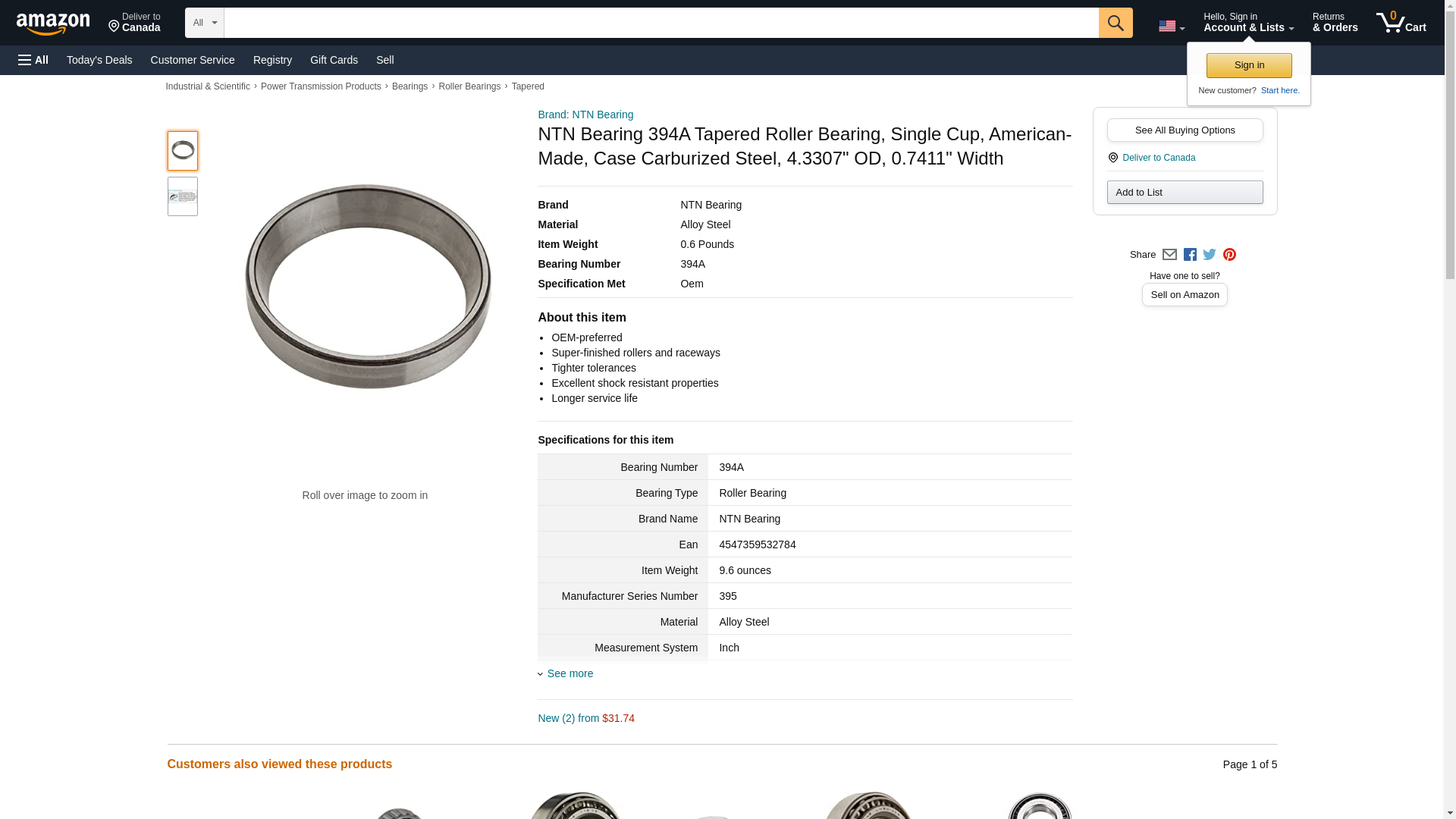 NTN Bearing 394A Tapered Roller Bearing, Single Cup, American-Made, Case Carburized Steel, 4.3307" OD, 0.7411" Width