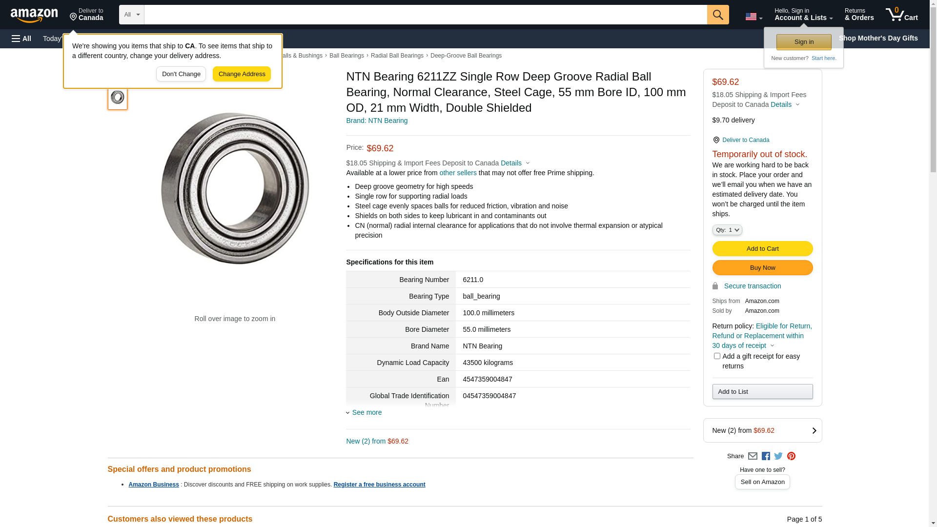 NTN Bearing 6211ZZ Single Row Deep Groove Radial Ball Bearing, Normal Clearance, Steel Cage, 55 mm Bore ID, 100 mm OD, 21 mm Width, Double Shielded