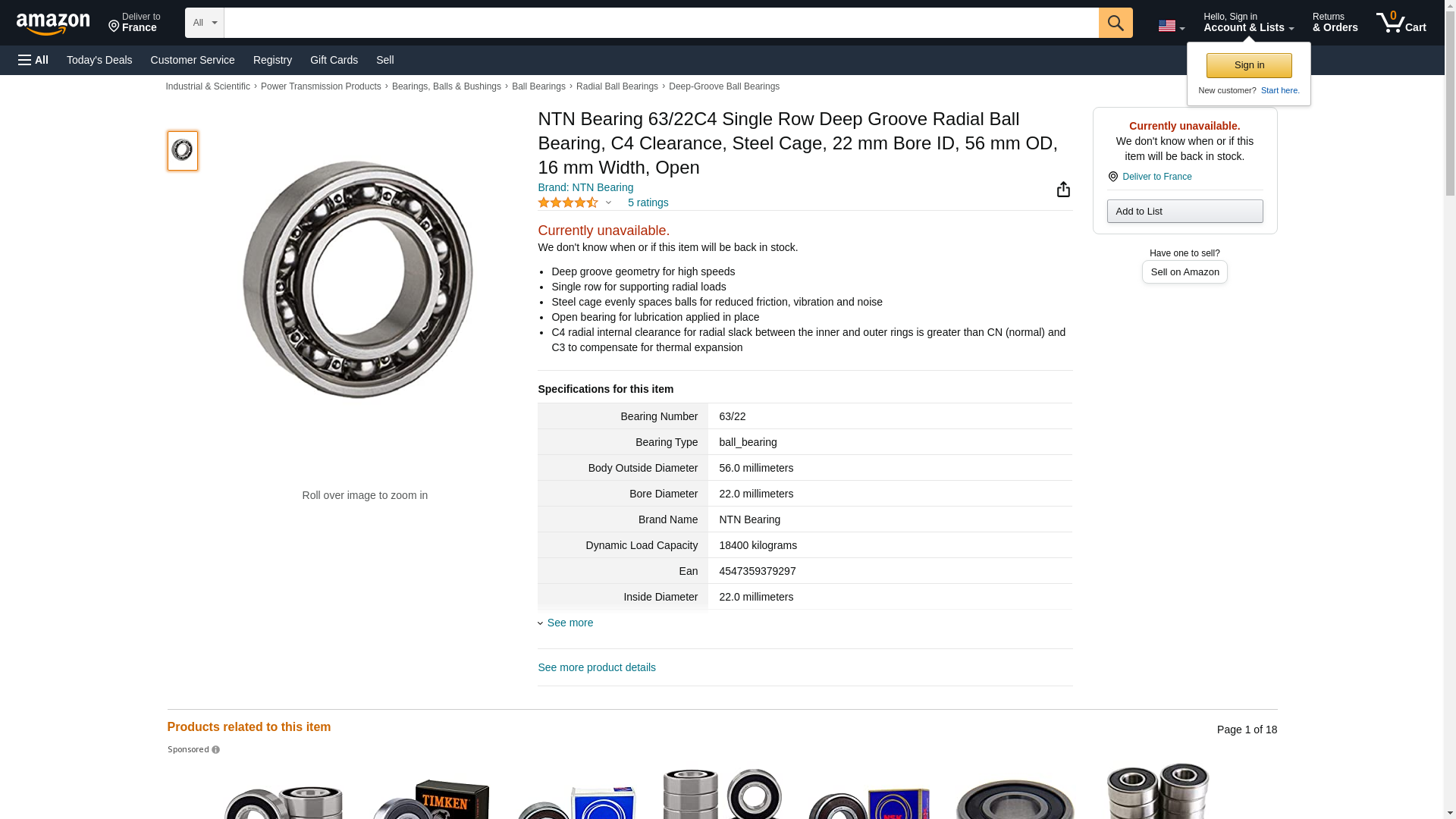NTN Bearing 63/22C4 Single Row Deep Groove Radial Ball Bearing, C4 Clearance, Steel Cage, 22 mm Bore ID, 56 mm OD, 16 mm Width, Open