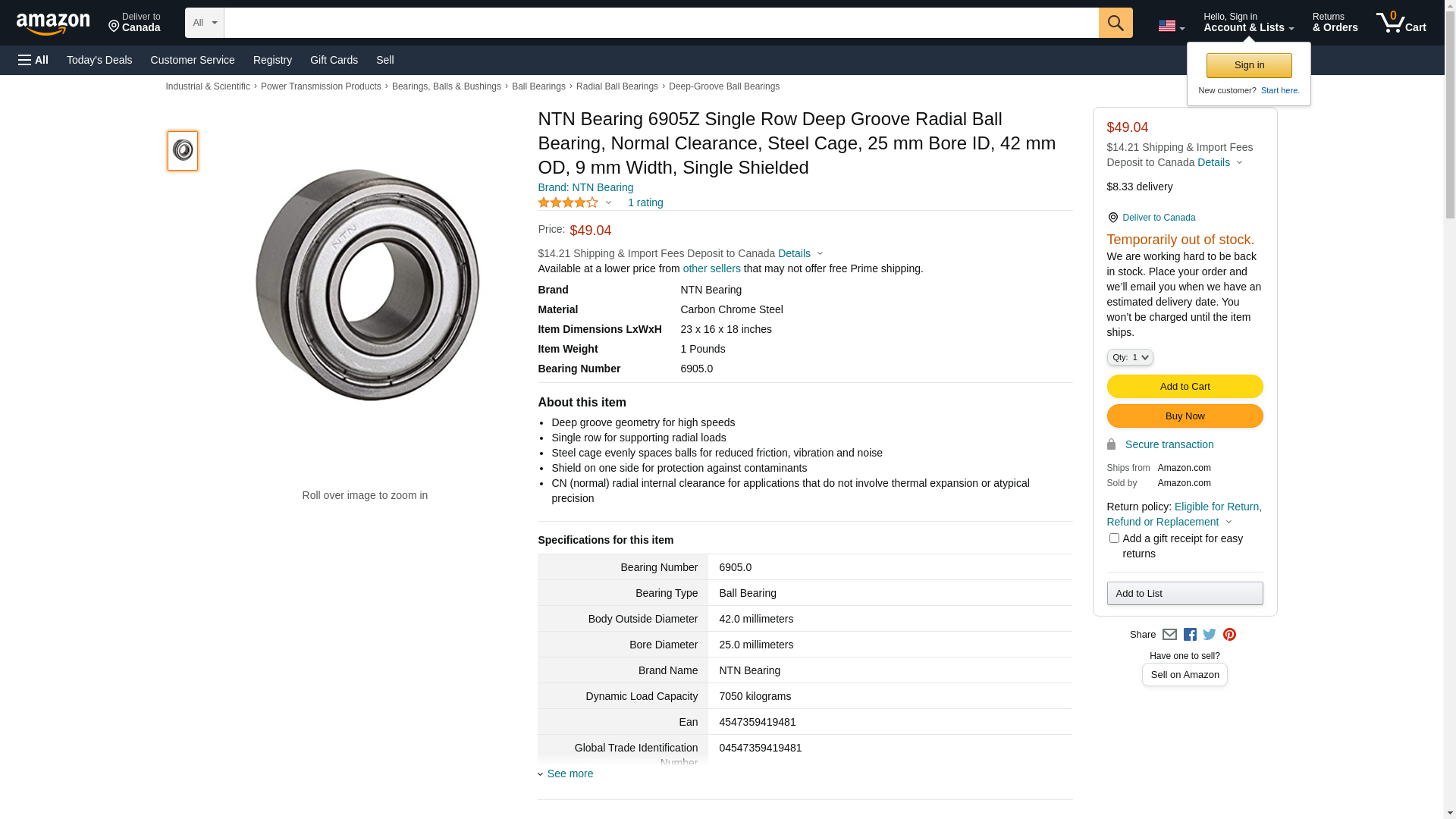 NTN Bearing 6905Z Single Row Deep Groove Radial Ball Bearing, Normal Clearance, Steel Cage, 25 mm Bore ID, 42 mm OD, 9 mm Width, Single Shielded