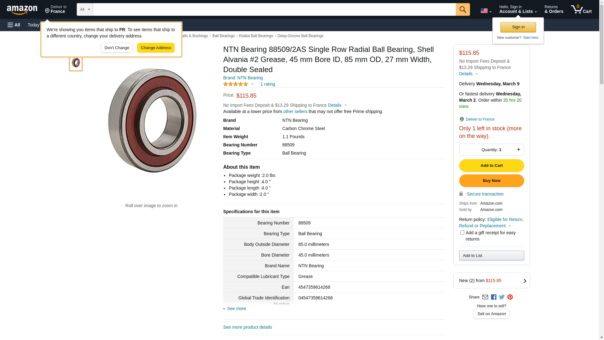 NTN Bearing 88509/2AS Single Row Radial Ball Bearing, Shell Alvania #2 Grease, 45 mm Bore ID, 85 mm OD, 27 mm Width, Double Sealed