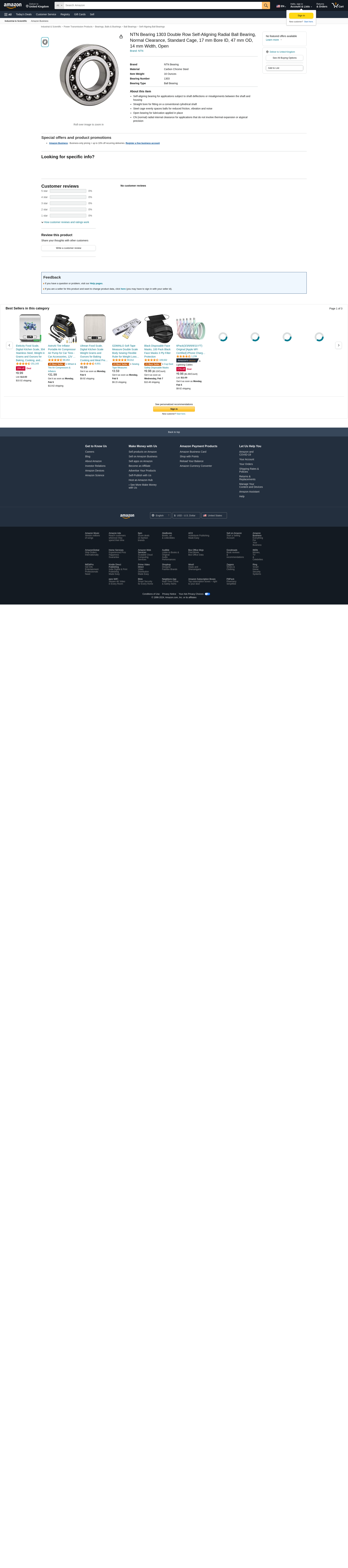 NTN Bearing 1303 Double Row Self-Aligning Radial Ball Bearing, Normal Clearance, Standard Cage, 17 mm Bore ID, 47 mm OD, 14 mm Width, Open