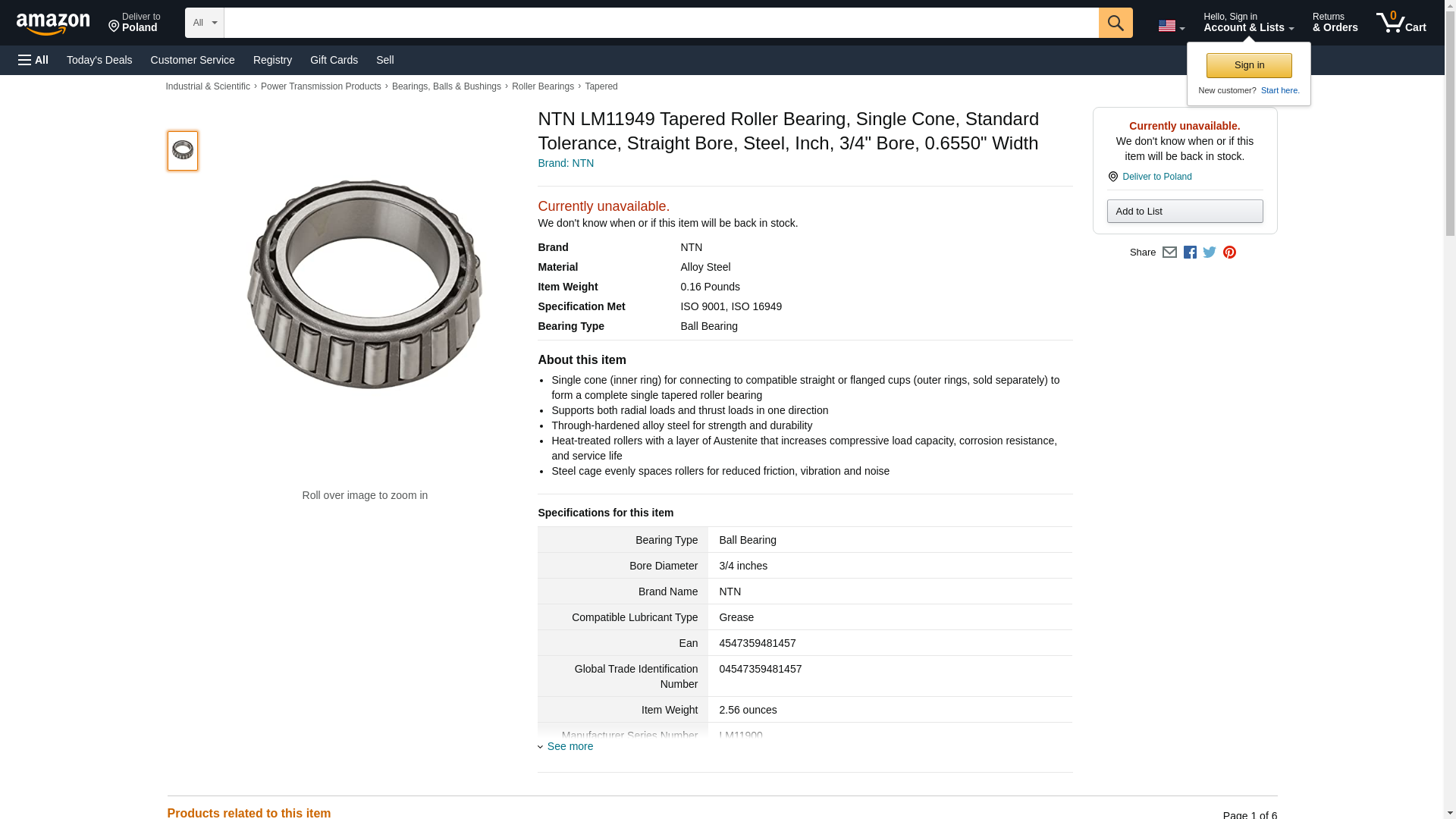 NTN LM11949 Tapered Roller Bearing, Single Cone, Standard Tolerance, Straight Bore, Steel, Inch, 3/4" Bore, 0.6550" Width