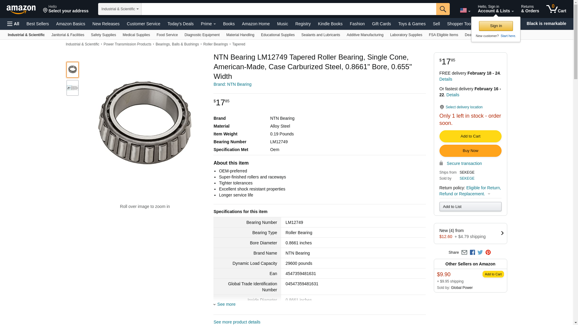 NTN Bearing LM12749 Tapered Roller Bearing, Single Cone, American-Made, Case Carburized Steel, 0.8661" Bore, 0.655" Width