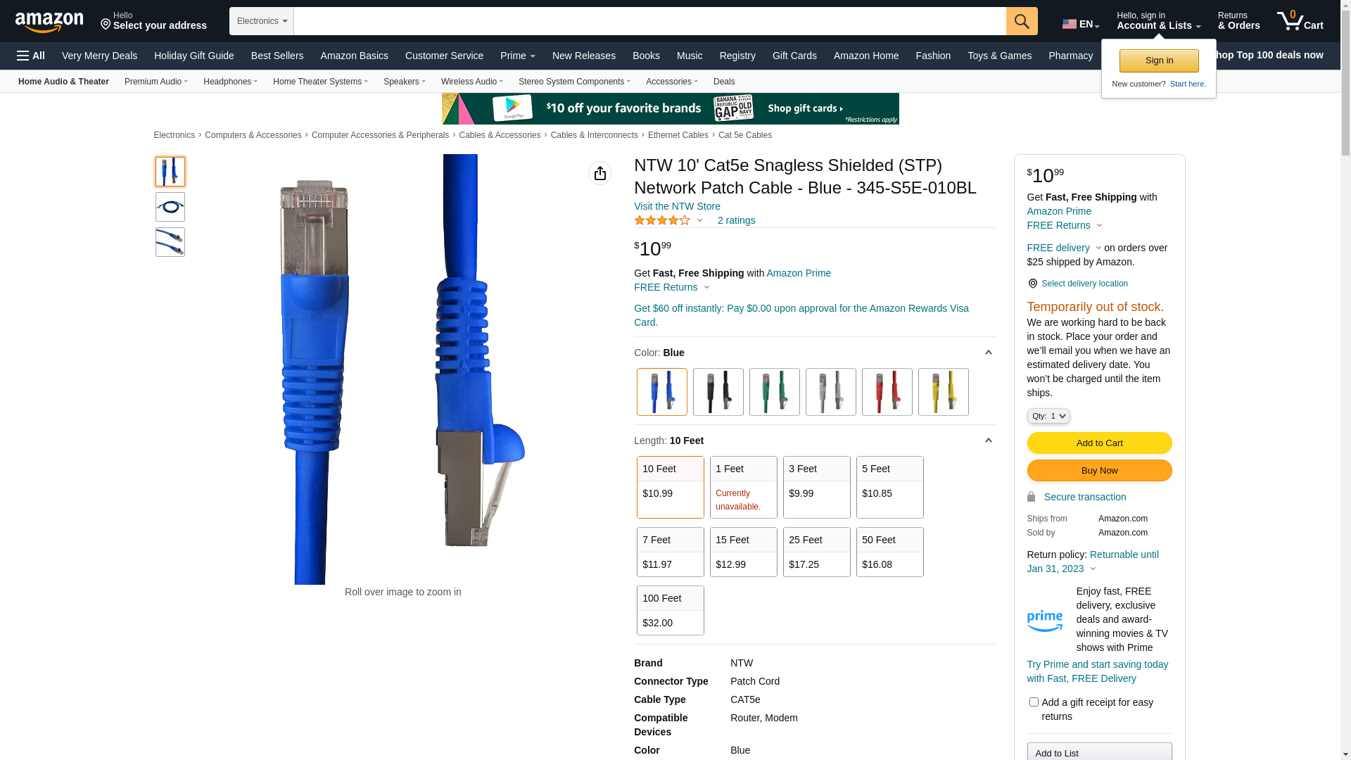 NTW 10' Cat5e Snagless Shielded (STP) Network Patch Cable - Blue - 345-S5E-010BL. STP Category 5E Patch Cords with 50...
