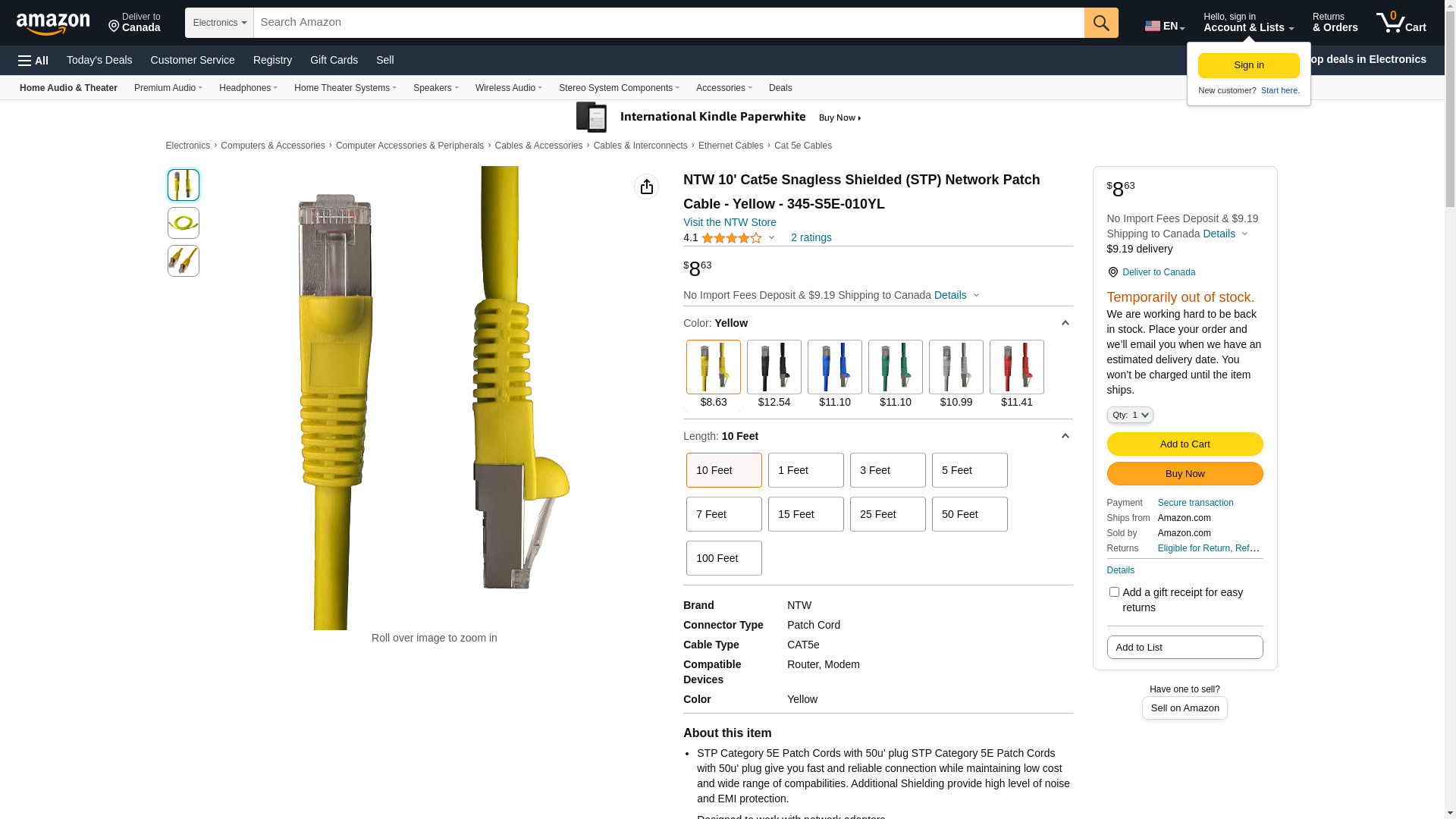 NTW 10' Cat5e Snagless Shielded (STP) Network Patch Cable - Yellow - 345-S5E-010YL. STP Category 5E Patch Cords with ...