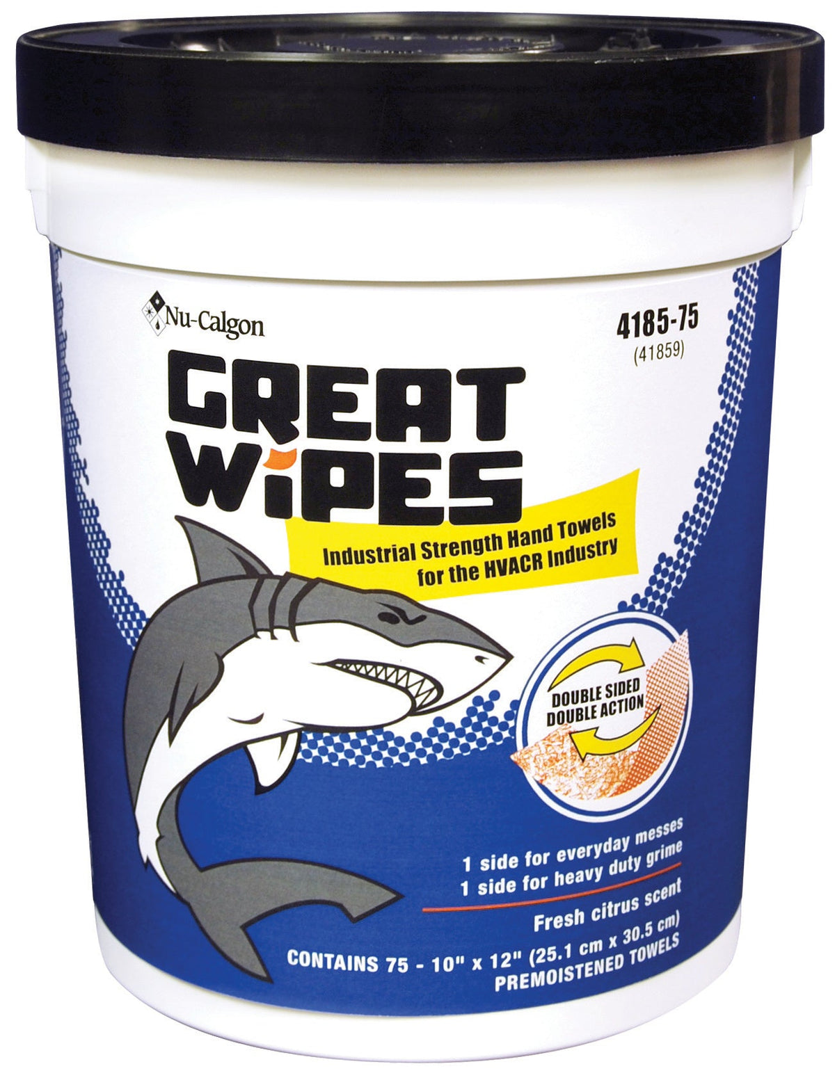 Great Wipes Industrial Strength Hand Towels are waterless wipes made specifically for the air conditioning, refrigeration, and plumbing service technician. Each premoistened, heavy duty towel has strong pumice scrubbing power that conveniently cleans anywhere and anytime. The powerful, yet safe, cleaning agents in Great Wipes work together with an absorbent, non-scratching abrasive hand towel. The result is hands that are clean and left residue-free with a pleasant orange fragrance. These shop size durable towels quickly absorb to remove substances, such as lubricant, grime, ink, tar, caulk, sealant paint, epoxy, adhesive, grease, urethane, and much more. Great Wipes can also be used to degrease tools, tool boxes, equipment, work surfaces, metal, vinyl, painted surfaces, compressor parts, components, and more.