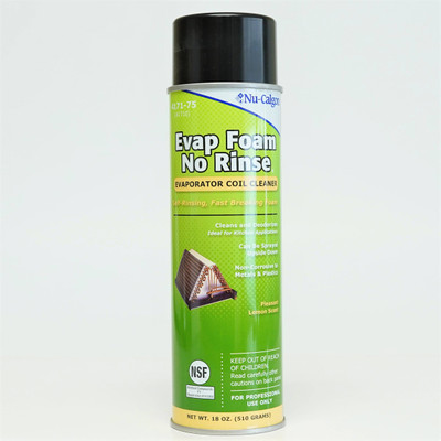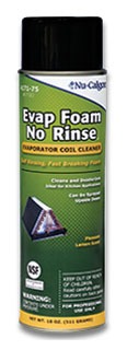 6 Pack of Evap Foam no rinse is a high performance, heavy duty detergent, specifically formulated with special surfactants and alkaline cleaners that have been developed into a foaming, no-rinse product. The aerosol product can be sprayed either right side up or upside down, and is ideal for use on most coils, but particularly suited for cooling or evaporator coils.Evap Foam will liquefy dirt, grease, oil, and other residues quickly and easily. Since it is fortified with corrosion inhibitors, it is safe for use on metals and other materials. The products fast-breaking foam is completely self-rinsing. Simply spray Evap Foam on the coil and the foam will wash the emulsified matter off. The aerosol product is NSF registered for use as a coil cleaner in and around food processing areas, and helps leave the area deodorized with a pleasant lemon scent.Drections for use: Turn off or disconnect power to unit being serviced, and remove any heavy or matted soils first. Shake well. Remove cap and point toward surface to be cleaned. Thoroughly saturate the targeted area with product. Be sure foam evenly covers the entire surface. With this self-rinsing formula, the foam will break and condensation will completely rinse the emulsified material. However, you may wipe clean or rinse with water if desired or if using on non-condensation producing coils. For extremely stubborn or heavy deposits, repeat applications may be necessary. Turn on or return power to the unit.