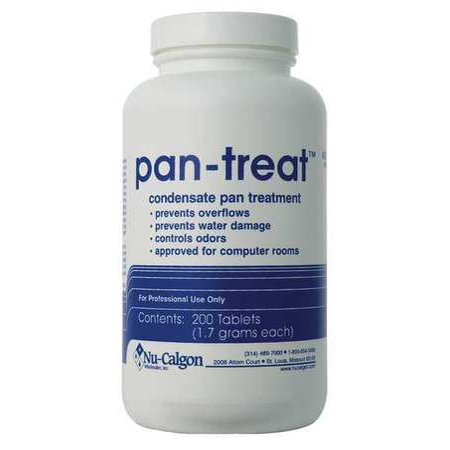 Left untreated, condensate pans can suffer from the build-up of sludge, scum and other accumulations. This build-up can cause odors as well as plugged drains and overflows, which in turn result in water damage. Pan-Treat is formulated with ingredients proven effective in cleaning and preventing these deposits, and its use will eliminate the extra maintenance costs associated with odors, plugged drains and overflows. Pan-Treat is extremely easy to use, and is safe, non-corrosive, non-toxic and biodegradable. The product is completely soluble in water and it does not form any deposits in the pan or drain. Directions for Use: Condensate Pans- If the pan is noticeably fouled, it can be cleaned by using two or more Pan-Treat tablets per ton of system capacity. Repeat until system is clean. For subsequent treatment or clean condensate pans, use one Pan-Treat tablet per ton each month. Position the tablets away from the drain and where they will achieve maximum contact with dripping condensate. This will assure more complete cleaning action and treatment. For larger systems, where the use of many tablets may be impractical, use Nu-Calgon's PanPads condensate pan products. Humidifiers- Pan-Treat tablets can be used to condition humidifier water in order to prevent odors and deposit build-up. Use 2-4 tablets every four to six weeks as needed. Clean and rinse out the humidifier reservoir on a regular basis.