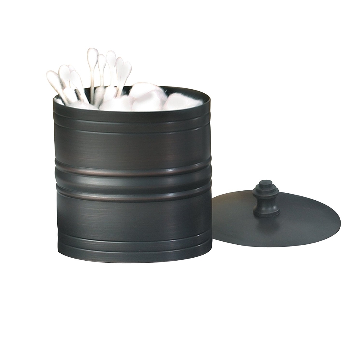 - COMPACT STORAGE: This canister is great for storing and organizing cotton swabs, ovals and rounds, makeup applicators and cosmetic sponges, wedges, guest soaps, bath bombs, balls, salts and more DURABLE CONSTRUCTION: Made from natural, eco-friendly STEEL WITH OIL RUBBED BRONZE FINISH accents; Works well in moisture rich bathroom environments;