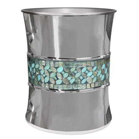 - THIS GENEROUSLY SIZED WASTEBASKET features an all-metal design with a belt of aqua glass mosaic. The Stainless Steel construction does not rust or hold odours. Compact enough to fit bathrooms, offices, and other compact residential spaces. Item measures in inches: 9.25" x 9.25" x 9.75".