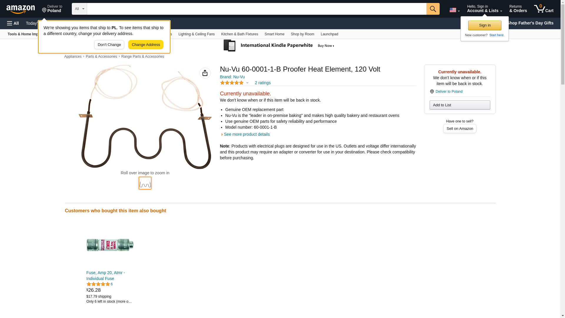 Nu-Vu 60-0001-1-B Proofer Heat Element, 120 Volt
