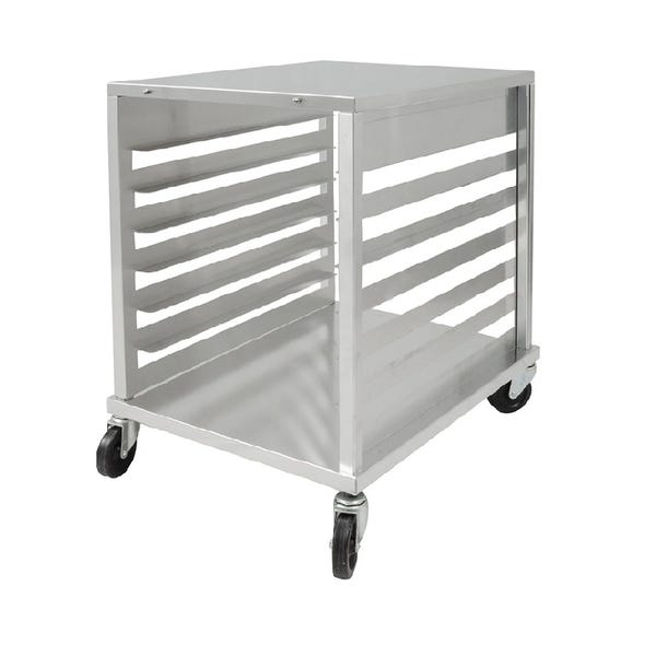 Knock Down Pan Rack, counter height, open sides, aluminum tubular frame, capacity: (7) full size pans or (14) half size pans, thumbscrew assembly, full size top, heavy duty casters, NSF. One year parts warranty, standard.