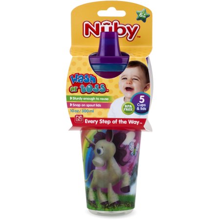 Nuby Wash or Toss 10 oz. Cups with Spout Lid (5 Pack) <p></p>Nuby's Wash or Toss Cups are durable enough to use again and again - and affordable enough to be disposable. These cups are perfect for an afternoon in the park or everyday home use Additionally the cups and spouts are easily stackable for travel or home storage. Fun patterns include animals, dragons, pirates and more. Colors and prints may vary. Set includes five cups and five lids - all of which are sturdy enough to reuse. Colors of printed cups include Blue, Green, Yellow, Purple, Orange, Red, and Pink. <p></p> <ul class="" ""bullet""""=""> <li>Snap-on Free Flow spout allows liquid to flow freely</li> <li>Colorful cups stack inside one another for easy storage</li> <li>Top rack dishwasher safe</li> <li>BPA Free - 10 oz. / 300 ml - 12 Months +</li> </ul>"" Case Pack 72 <b>Please note: If there is a color/size/type option, the option closest to the image will be shipped (Or you may receive a random color/size/type).</b>