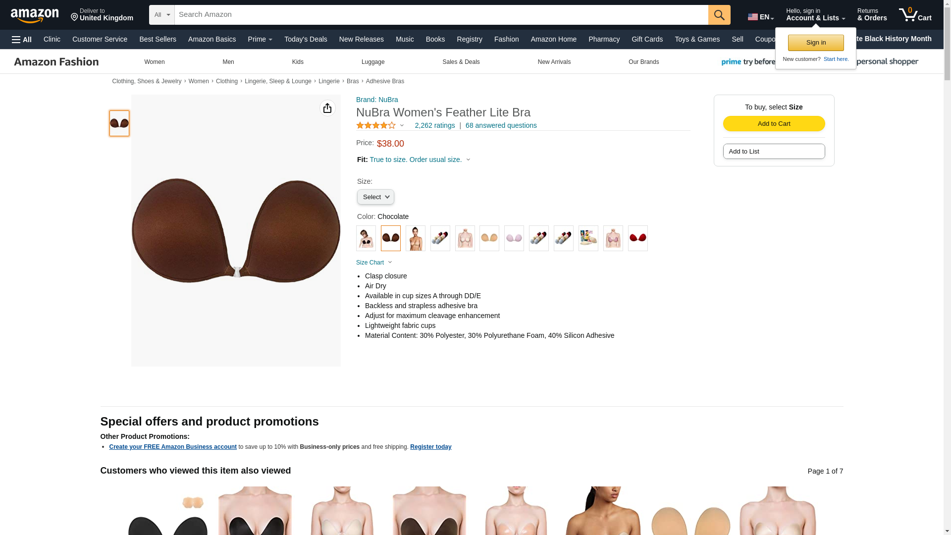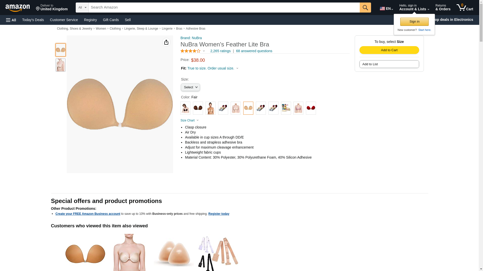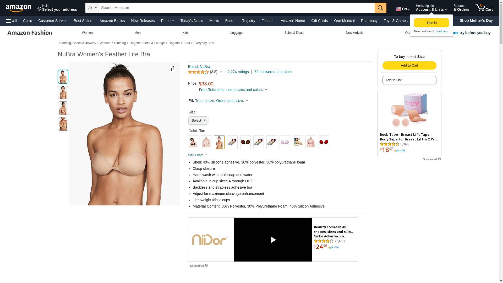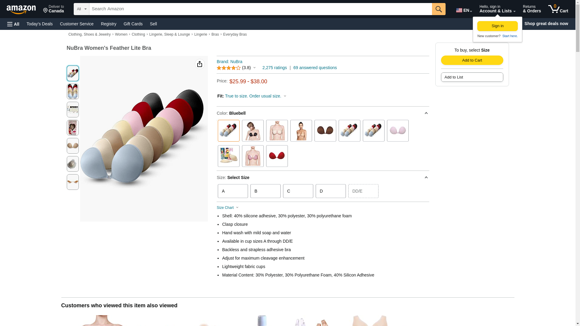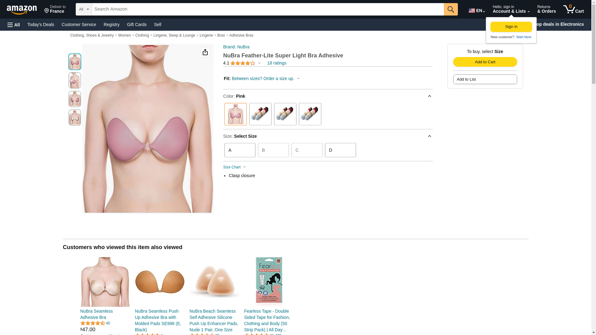 NuBra Feather-Lite Super Light Adhesive Bra F700The lightweight, versatile fabric cups are perfect for everyday wear with any outfit. The center clasp allows for adjustable cleavage enhancement and the skin-friendly silicone adhesive is comfortable and reusable. This bra is backless, strapless and does not require a band measurement.We suggest sizing your NuBra based on your current cup size. If you are between sizes, we recommend sizing down. The adhesive surface works best when in maximum contact with your breast. NuBras are not intended for full coverage, but can be positioned to provide support and cleavage control.How To WearClean your chest with mild soap and water and towel dry. Place one side at a time. In front of a mirror, take one bra cup carefully by the edges and set it to the desired position on your breast. It is best to place the cup on the outside of your breast with the clasp pointing to your belly button. Smooth the edges onto your breast, leaving 2 to 3 finger widths from the bottom. Connect the front clasp. With both hands on the bra cups, press firmly for a few seconds for a secure hold.How To CleanWash your NuBra after each use to remove any body oil or other products. DO NOT MACHINE WASH OR DRY. To clean, wet the adhesive surface with warm water. Add 2 or 3 drops of mild, non-moisturizing liquid soap. We recommend Nu Wash, our cleanser. Using your fingertips in a circular motion gently lather the soap. Avoid using your fingernails, as they can tear the adhesive. Use warm water to remove all residue. Shake off excess water and air dry completely. Do not use a towel or a blow dryer and do not machine dry.How To StoreWhen completely dry, place in original case to prevent dust from gathering on adhesive. Keep in a cool, dry place. Avoid direct sunlight. With proper care, your NuBra will last for many wears.