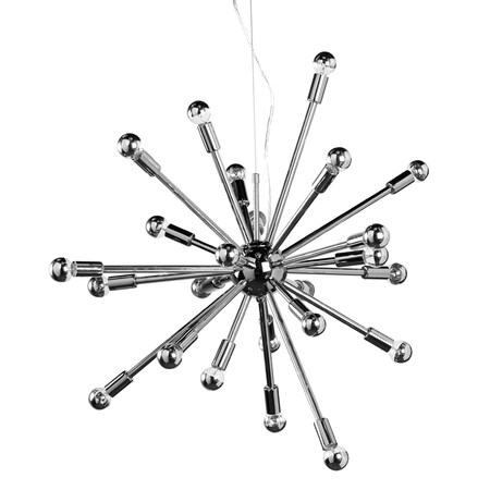 Chromed metal light fixture with iconic satellite look. Clear cord with 4\" canopy supplied for hardwire installation.Total Diameter: 39.4\" inchesCord Length: 61\" inches max adjustableTakes 24 E12-base, 25-watt bulbs; included