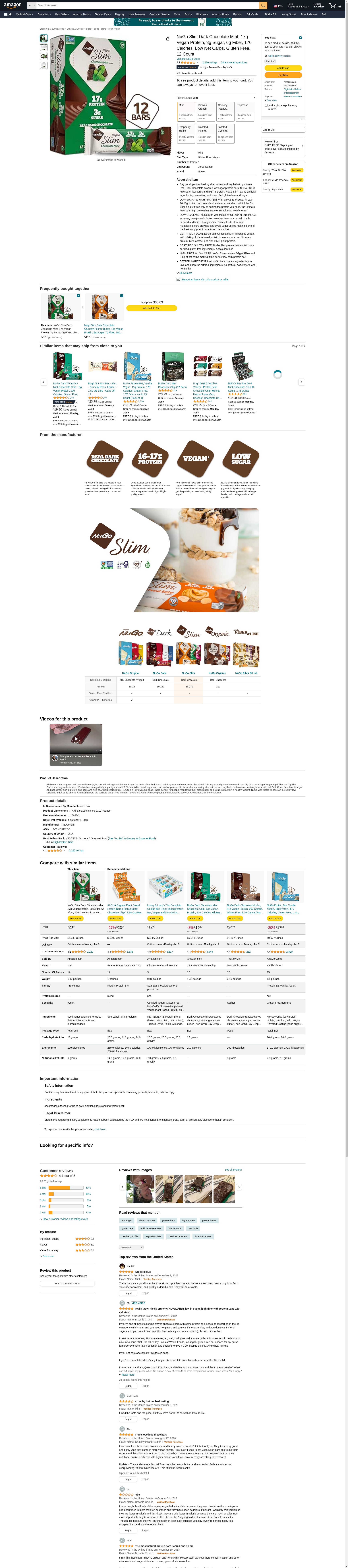 NuGo Slim Dark Chocolate Mint, 18g Vegan Protein, 3g Sugar, 6g Fiber, 180 Calories, Low Net Carbs, Gluten Free, 12 Count: Maxedbuy.com