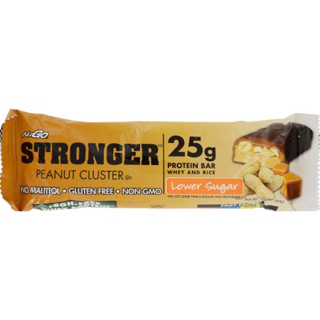 NuGo Nutrition - Stronger Protein Bar Peanut Cluster - 2.82 oz. (80 g) NuGo Nutrition Stronger Protein Bar Peanut Cluster is a layered high protein bar with an amazingly delicious blend of peanut nougat, peanuts, and rich delicious caramel, all wrapped in a chocolate coating. NuGoStronger Peanut Cluster is a remarkable high-performance bar that delivers the quality nutrition you need to achieve serious results from your workout and recovery experience. Stronger Protein Bar Peanut Cluster Features: Real Dark Chocolate Which Has Real Health Benefits High Protein - 25g, High Fiber - 12g, Lower Sugar- Only 9g Certified Gluten Free & Kosher No Soy Ingredientsor Maltitol Includes Non-GMO Ingredients Stronger Packed with 25g or more of non-GMO protein, NuGo Stronger is the perfect training partner. Grab one before you hit the gym for sustained energy or enjoy one after your workout to aid in quick muscle recovery. High protein helps build muscle and provides explosive energy with ultra-pure, premium grade whey protien. The high-quality, rBGH hormone-free whey protein provides nothing but the best results. And, if you're sensitive to soy, NuGo Stronger is the protein solution for you. No soy*. Just taste. (*Cookies 'N Cream flavor contains soy lecithin.) High Protein Protein is the building block of muscle. Therefore, a high-protein diet is a must for high-performance athletes. For those who wish to increase their protein intake without excess fat and carbohydrates, NuGo Nutrition has a number of smart choices. NuGo Slim, with 15-17g of protein, and NuGo Stronger, boasting 25-27g of protein, are both great-tasting sources of protein to help you build muscle and stay at your peak. Lifestyle NuGo for Your needs. If you have certain chronic health conditions, such as diabetes or celiac disease, it's not always easy to monitor and regulate your diet, particularly if you have a busy active lifestyle. That's why