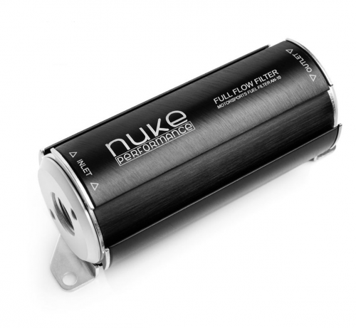 Nuke Performance Black Fuel Filter - 10 Micron For use on turbo-charged, super-charged and Naturally aspirated engine applications. Nuke Performance filters are an inexpensive insurance policy to protect your engine. Designed to stand up to the destructive properties of alcohol fuels, including methanol and ethanol. High-flow, 10-micron or 100-micron, cleanable element. The units withstand high flow with minimal pressure drop. The Mounting Brackets give a tight and safe mounting to the filters it is also Stainless Steel for a long lasting, corrosion-free appearance. Nuke Performance strongly recommends changing the internal filter unit once a season, especially when using ethanol. Technical information Aluminium extrusion 6062-T6. Fuel filter with 3/4 UNF thread. Stainless steel brackets for simple installation. Delivered with brackets and two dash 8 and a filter of 10 or 100 microns. 3/4 UNF Ports, available Fittings to adapt these filters to AN-10, -08 or -06 line.