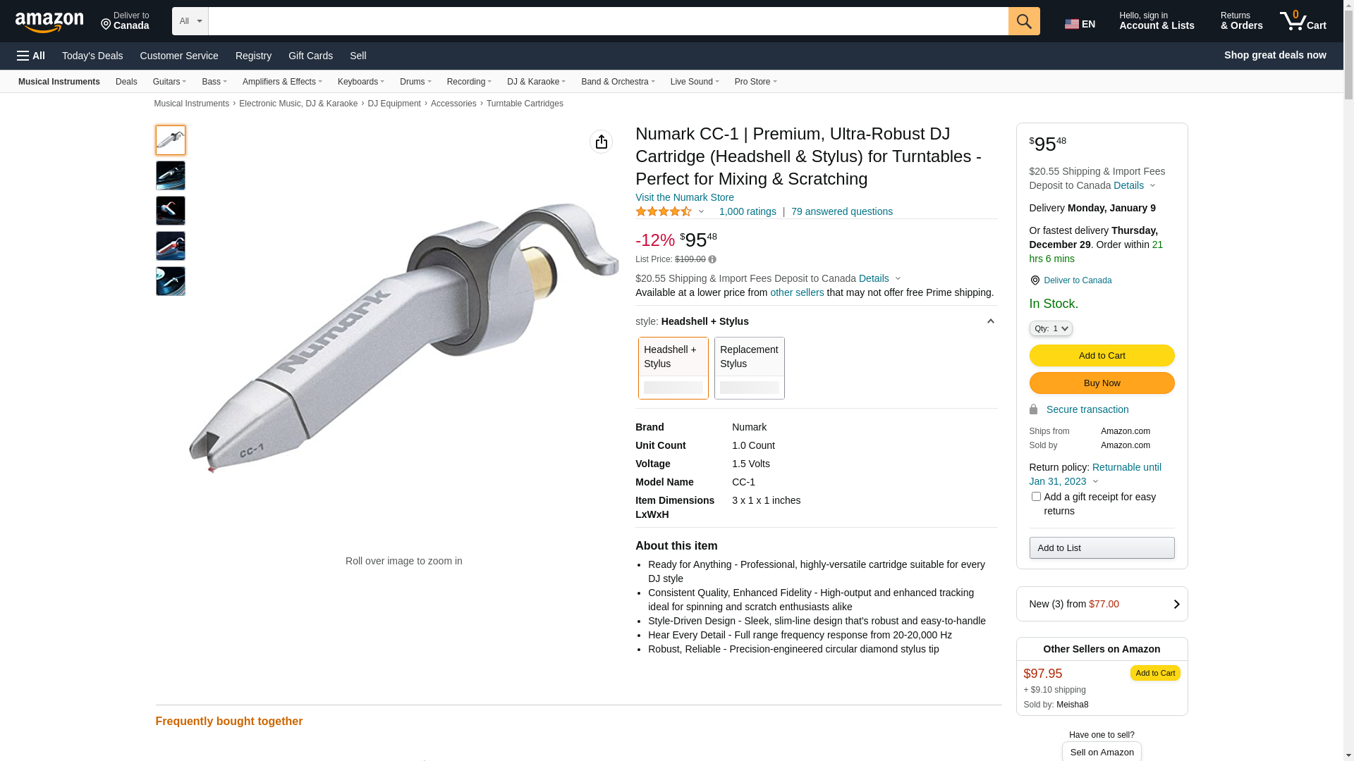 Numark CC-1 | Premium, Ultra-Robust DJ Cartridge (Headshell & Stylus) for Turntables - Perfect for Mixing & Scratching