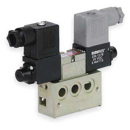 Solenoid Air Control Valve, Valve Ways and Positions 4-Way/3-Position, Voltage 24V DC, Center Position Closed, Valve Actuator / Return Solenoid / Solenoid, Pipe Size 1/8 in, Max. CFM - Valves 16 cfm, Operational Pressure Range 0 to 150 psi, NEMA Classification NEMA 4, Valve Vacuum Range 0 to 28 in Hg, Body Style Body Ported, Pilot Port Size 1/8 in NPT, Coefficient of Volume 0.35, DIN DC Plug-In Solenoid Electrical Connections, Shifting Technology Spool & Sleeve, Power Consumption 6 W