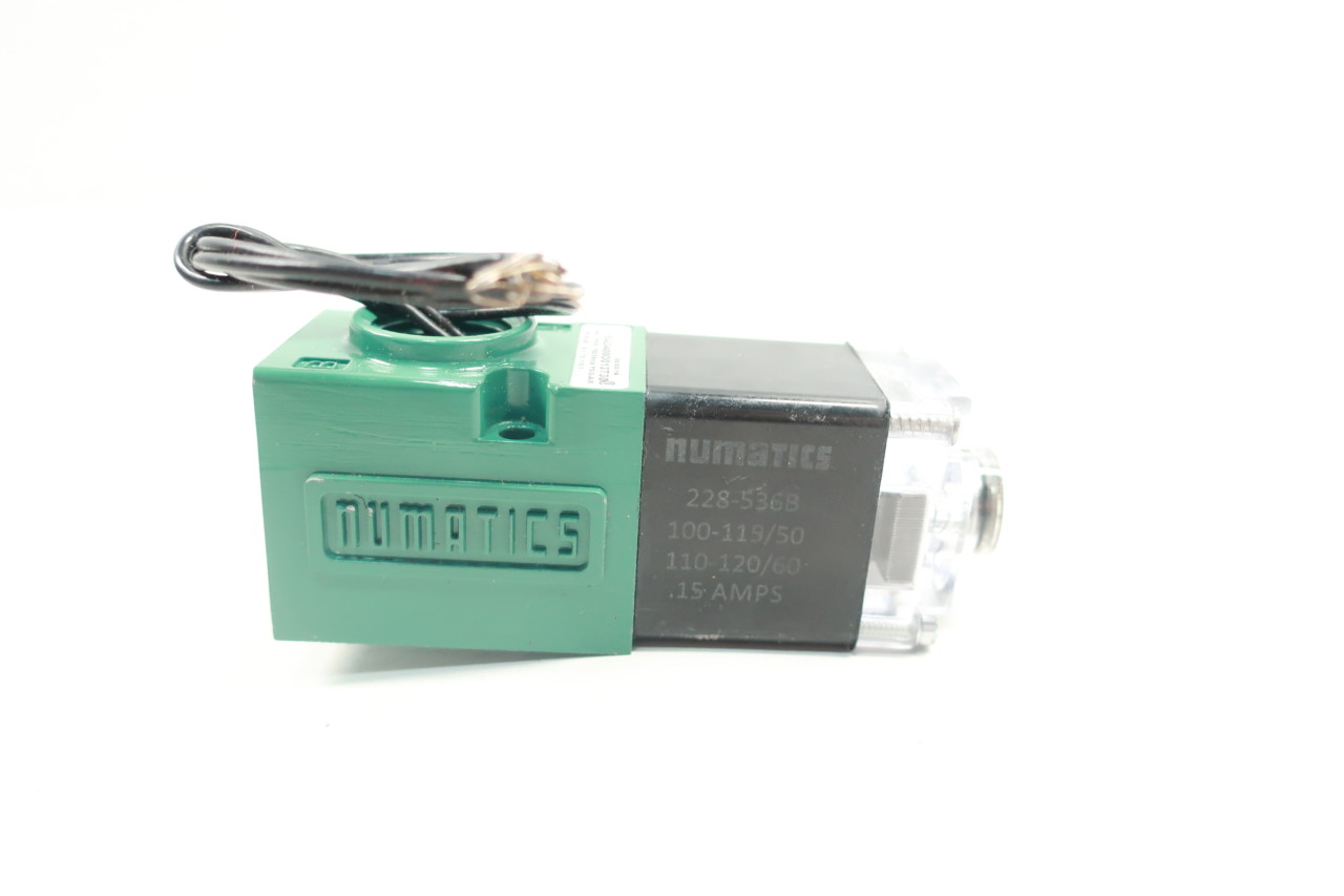 Numatics Mark 7 series single solenoid valve has pressure rating of 28" Hg vacuum to 300 psig features 1/8" NPTF connection and 120 VAC coil Brand Name|Numatics#MFR Part Number|11SAD400O013T30#UNSPSC|40141605#Item|Single Solenoid Valve#Type|Direct Acting, Spring Return#Series|Mark 7#Size|1/8 in#End Connection|NPTF#Pressure Rating|28 in Hg Vacuum to 300 psig#Valve Design|2 Pos/4-Way#Flow Rate|18 scfm#Coil Voltage|120 VAC#Electrical Connection|Standard Hardwired AC#Mounting Type|Base#Temperature Rating|-10 to 115 deg F#Dimensions|4.29 in Length x 1.70 in Width x 2.72 in Height#Standard/Approvals|ANSI Specified