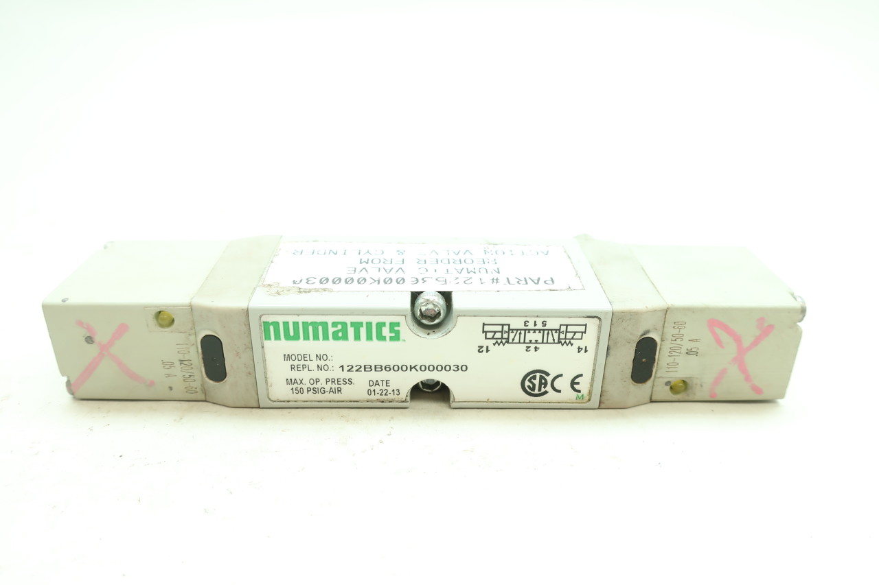 - Brand Name|Numatics#MFR Part Number|122BB600K000030#UNSPSC|40141605#Item|Double Solenoid Valve Unit#Type|Air Pilot#Series|2012#Size|1/4 in#Pressure Rating|28 in Hg Vacuum to 150 psig#Valve Design|3 Pos/4-Way Closed Center#Flow Rate|56 scfm#Coil Voltage|110 - 120 VAC 50/60 Hz#Electrical Connection|Plug-In AC with Light#Temperature Rating|-10 to 115 deg F#Enclosure Rating|NEMA 4/IP65#Includes|Flush Non-Locking Override#Standard/Approvals|CSA, CE Certified