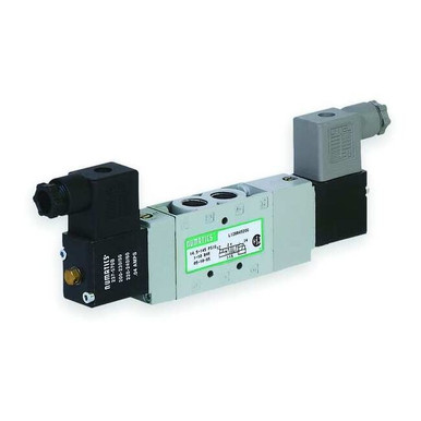 Solenoid Air Control Valve, Valve Ways and Positions 4-Way/2-Position, Voltage 24V DC, Valve Actuator / Return Solenoid Air Pilot / Solenoid Air Pilot, Pipe Size 3/8 in, Max. CFM - Valves 79 cfm, Operational Pressure Range 15 to 150 psi, NEMA Classification NEMA 4, Valve Vacuum Range 0 to 28 in Hg, Body Style Body Ported, Pilot Port Size 3/8 in NPT, Pilot Pressure 14.5 to 150 psig, Coefficient of Volume 1.7, DIN DC Plug-In Solenoid Electrical Connections, Shifting Technology Spool & Sleeve