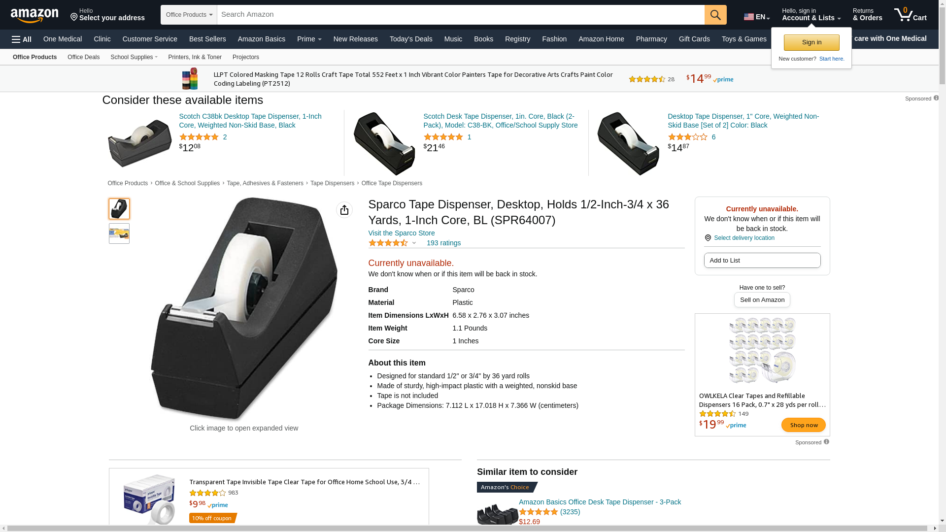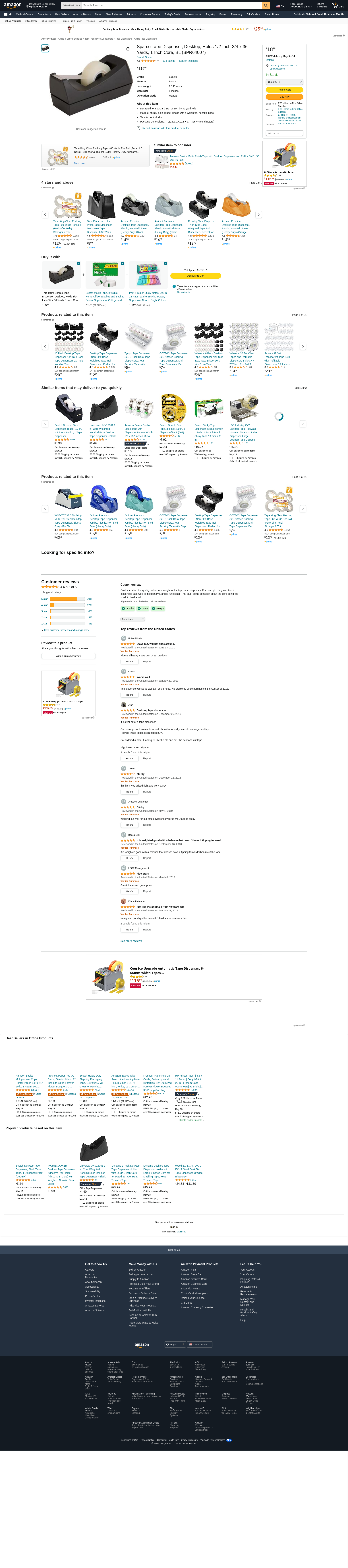 Sparco Tape Dispenser, Desktop, Holds 1/2-Inch-3/4 x 36 Yards, 1-Inch Core, BL (SPR64007). Designed for standard 1/2"...