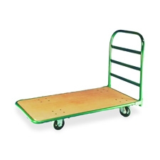 Platform truck features a 1" continuous tubular frame made of power-coated steel. Deck and casters are bolted to steel channel cross members. Frame has rounded front corners to protect walls, boxes and doorways. Wheels are rubber molded to cast iron. Pipe handle is included with deck. Platform truck holds up to 1,400 lb.
