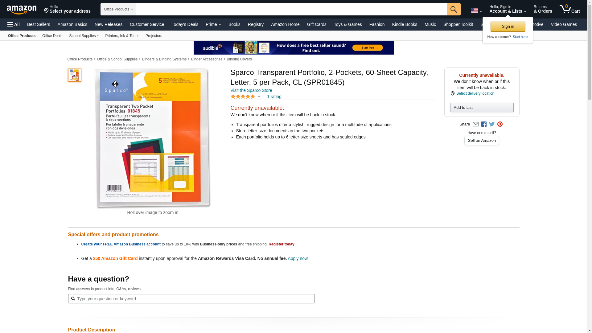 Sparco Transparent Portfolio, 2-Pockets, 60-Sheet Capacity, Letter, 5 per Pack, CL (SPR01845)