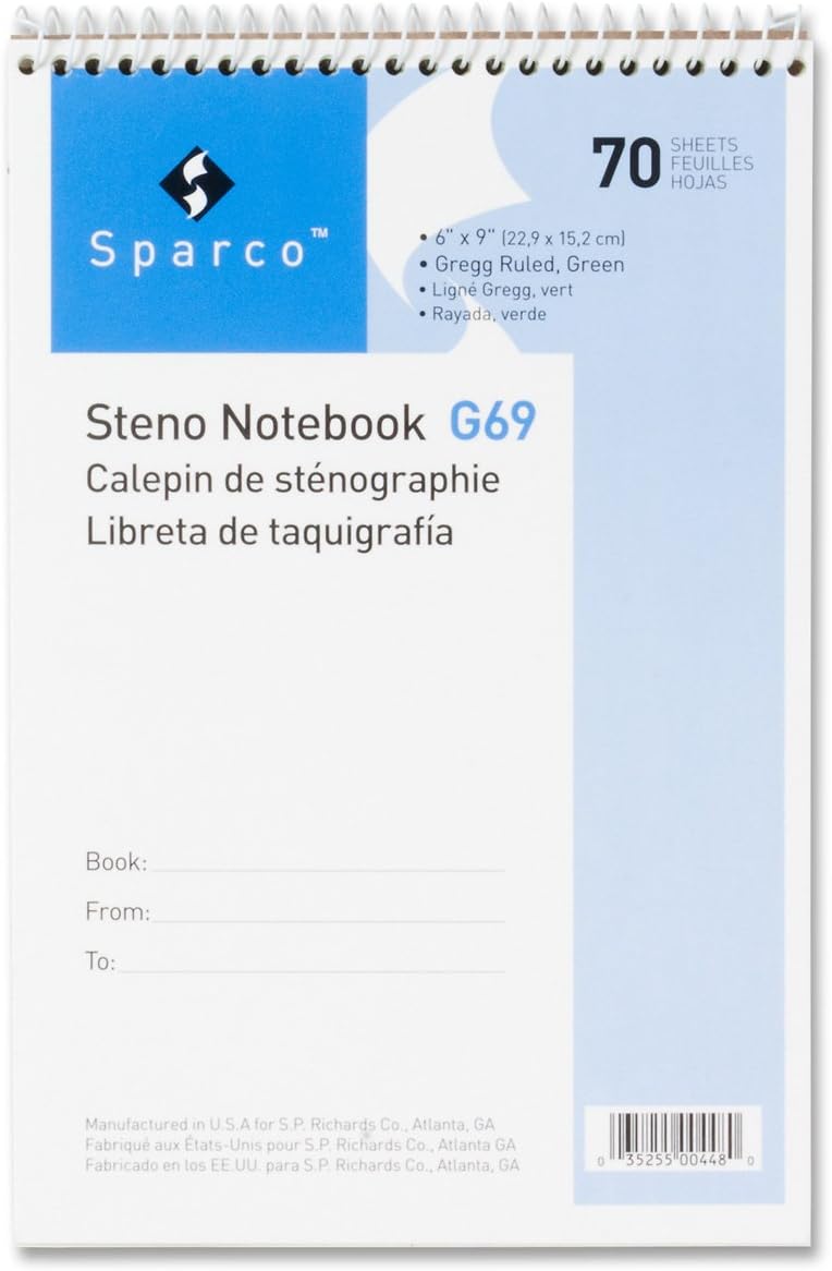 Sparco Steno Notebook, Gregg Ruled, 70 Sheets, 6 x 9 Inches, Green (SPRG69)