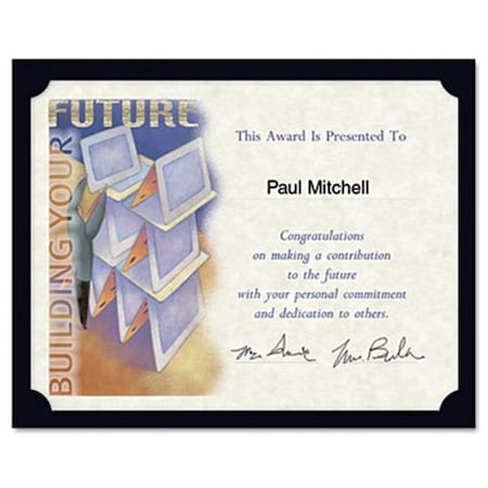 Heavyweight 105-lb. linen cover stock helps convey the significance of the award. Provides quick display. Die-cut corners, with attractive curved edge, provide easy placement of certificate. Holds certificates for landscape or portrait presentation. Color(s): Black; Width: 12"; Height: 9 1/2"; Insert Size: 8 1/2 x 11.