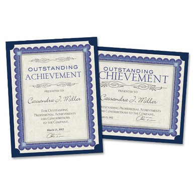 Heavyweight 105-lb. linen cover stock helps convey the significance of the award. Provides quick display. Die-cut corners, with attractive curved edge, provide easy placement of certificate. Holds certificates for landscape or portrait presentation. Color(s): Navy; Width: 12""; Height: 9 1/2""; Insert Size: 8 1/2 x 11.